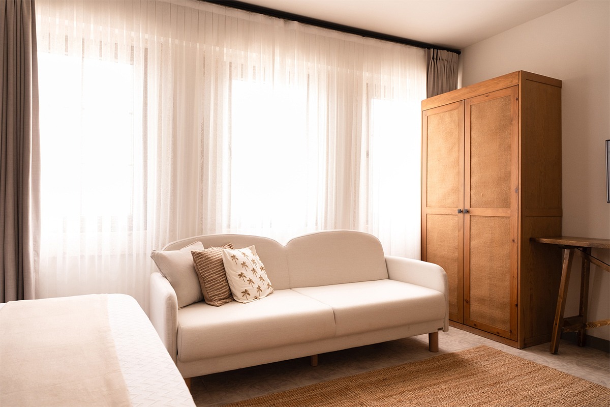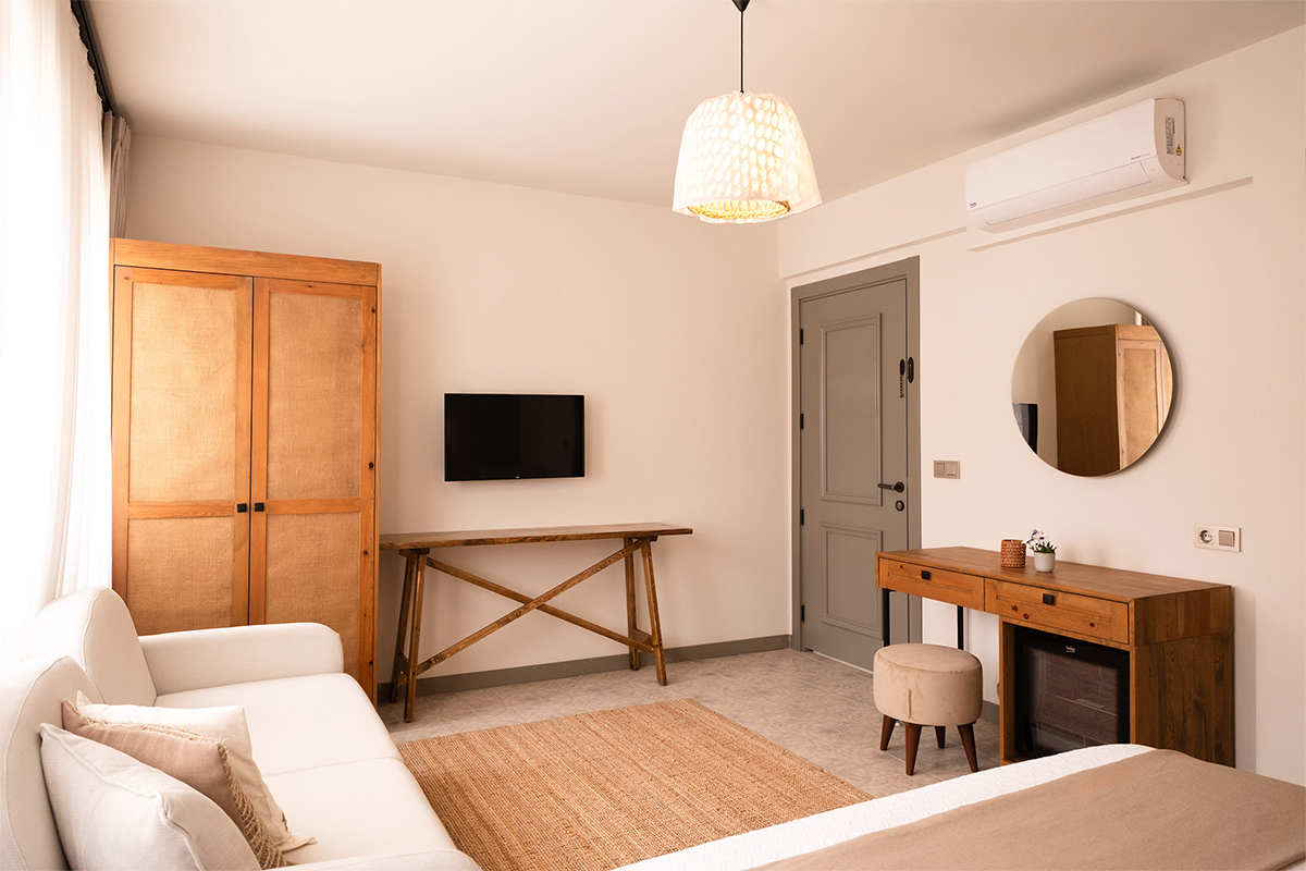 Doğal ışıkla bütünleşen pencere açıklıkları, nötr tonlardaki sade iç tasarım ve doğaya açılan genişliğiyle huzurlu ve aydınlık bir atmosfer sunar. Bahçenin dinginliğiyle denizin ferahlığını bir arada hissedebileceğiniz bu oda, tatilinize denge ve sakinlik katar.